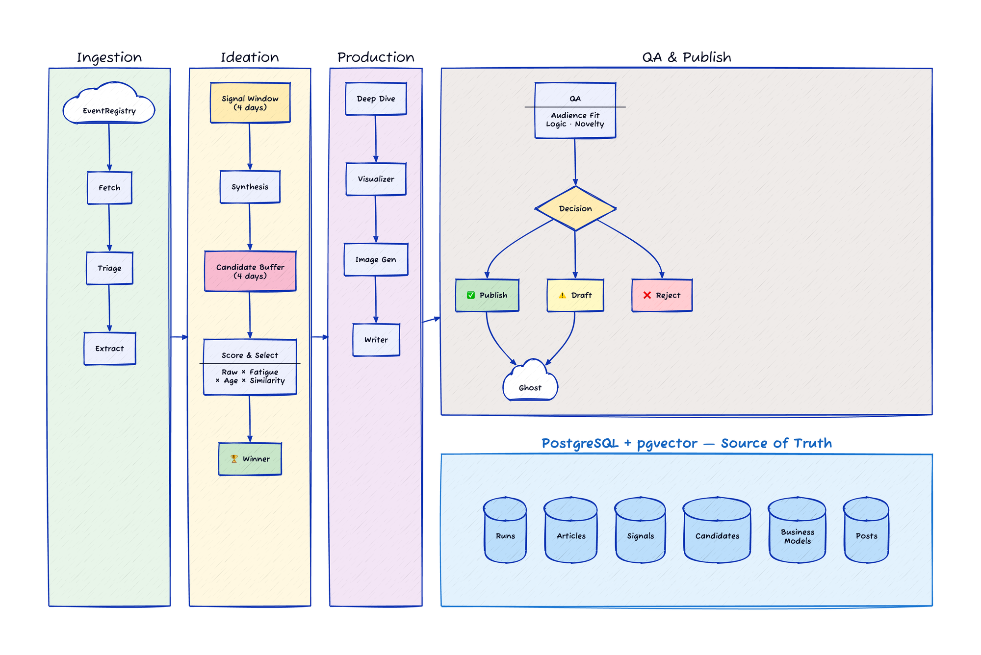 The pipeline handles everything: fetching news, filtering out noise, extracting business signals, synthesizing themes, generating visuals, writing the content, running quality checks, and publishing to Ghost CMS. Ten steps, fully automated, running daily.